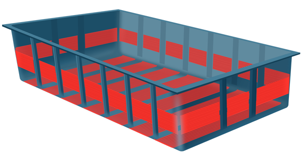 Fiberbelt™ - это система поясов запрограмированного нагружения. Она использует преимущества конструкционной стеклоткани UDF. Пояса Fiberbelt™ принимают на себя основную нагрузку от давления грунта и воды по всей площади бассейна и эффективно направляют её к структурным рёбрам Advanced beam™ и геометрическим элементам сбора нагрузок.