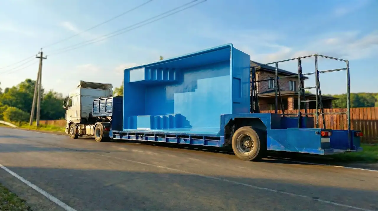 Композитные бассейны относятся к крупногабаритным изделиям. Небольшие модели перевозятся на автомобилях с открытым кузовом, например на «Газели». Крупные чаши транспортируются на специальных прицепах с оформлением соответствующего разрешения в дорожных службах.