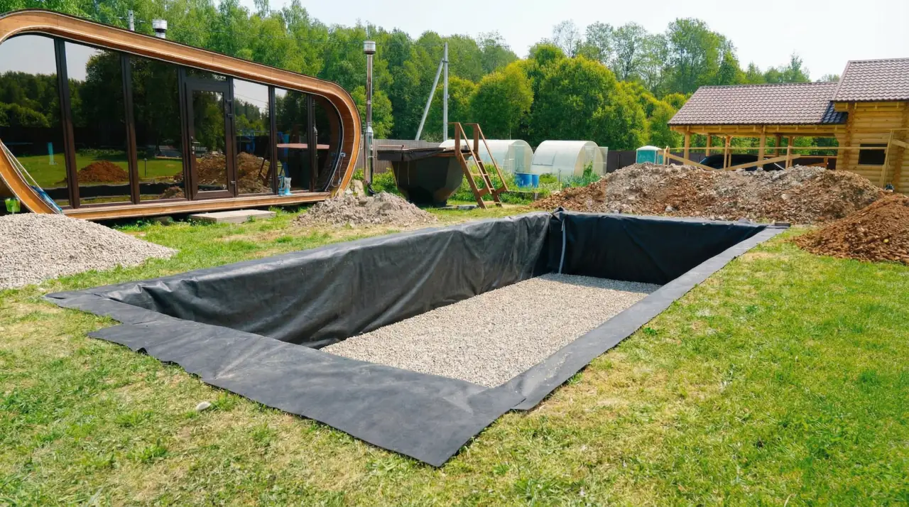 Основание котлована должно быть плотным и устойчивым, без рыхлого или насыпного грунта. В зависимости от конструкции бассейна дно выполняется ровным либо с уклоном. После подготовки основания на дно и стенки котлована укладывается геотекстиль средней плотности.